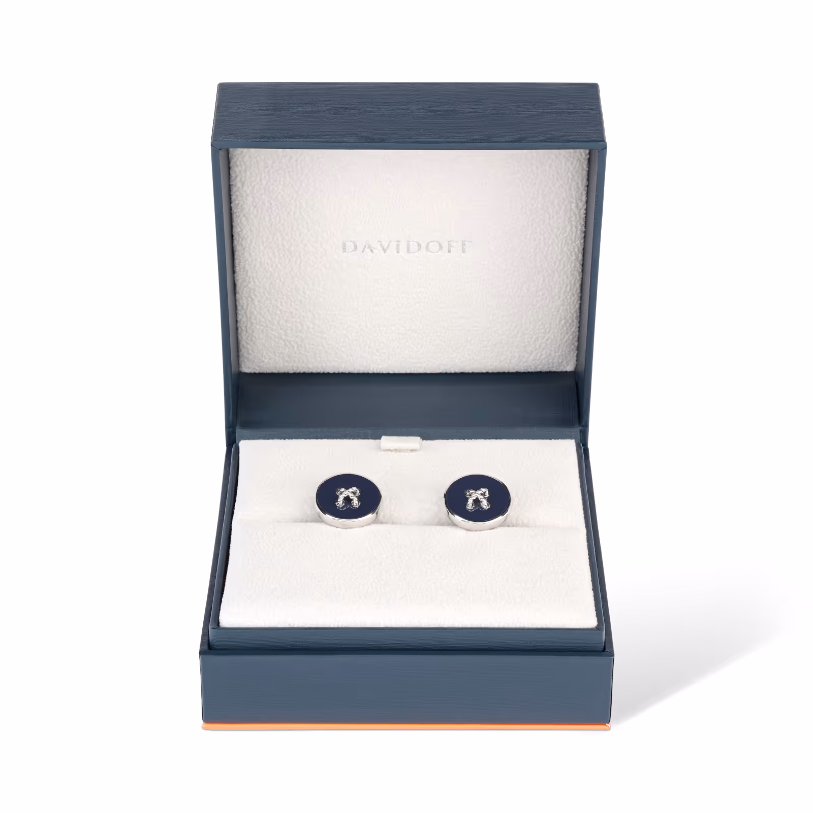 Crafted from brass with a flash rhodium-plated finish, these button-style cufflinks feature a stitched design accented by a lustrous night blue lacquer for a refined, polished look. The whale-back closure is etched with the DAVIDOFF logo and shaped in the brand’s exclusive hyphen design, while the DAVIDOFF Icon is engraved on the reverse for a subtle signature detail. Measuring 18 x 5 mm, they blend timeless elegance with distinctive craftsmanship.