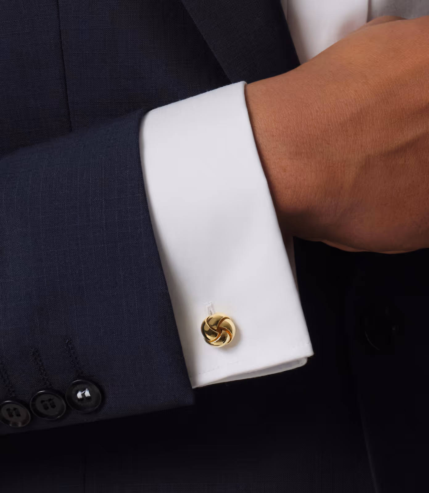 Elegant cufflinks from the DAVIDOFF ESSENTIALS collection captivate with minimalist chic and timeless elegance. Traditionally designed in England and crafted from light gold-plated brass, this cufflink set in an attractive knot shape expresses refined taste. The whale-back closure with DAVIDOFF logo completes the composition.