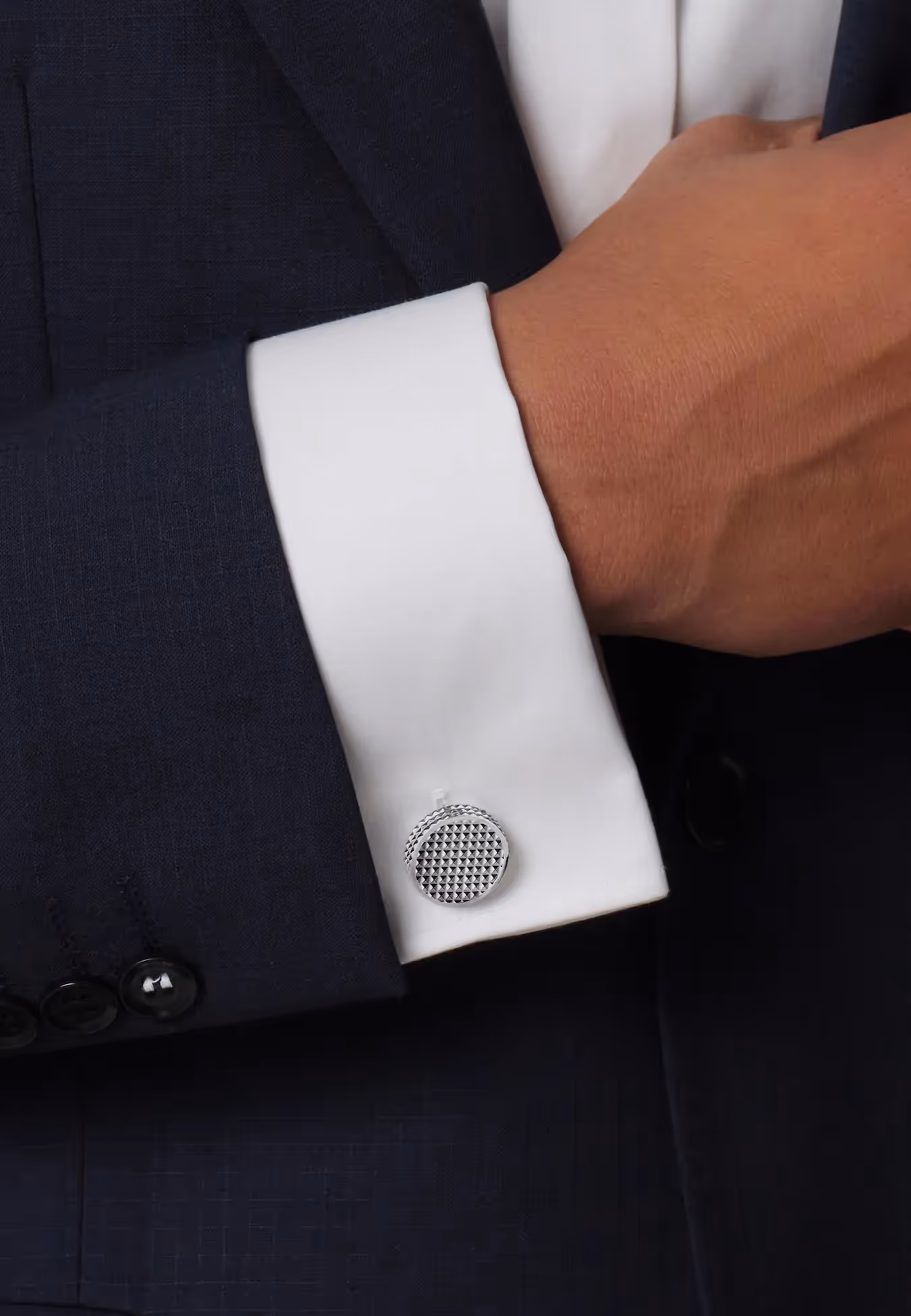 Round shape with timeless Clous de Paris pattern. Stainless steel flash rhodium plated. Fitting in exclusive hyphen shape with DAVIDOFF logo etching. DAVIDOFF icon on the backside.