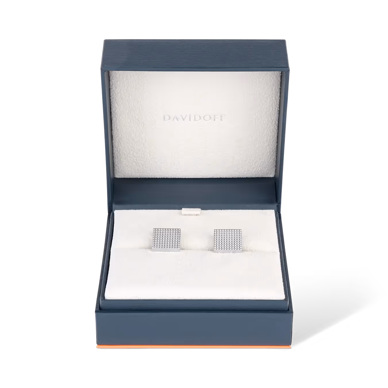 Square shape with timeless Clous de Paris pattern. Stainless steel flash rhodium plated. Fitting in exclusive hyphen shape with DAVIDOFF logo etching. DAVIDOFF icon on the backside.