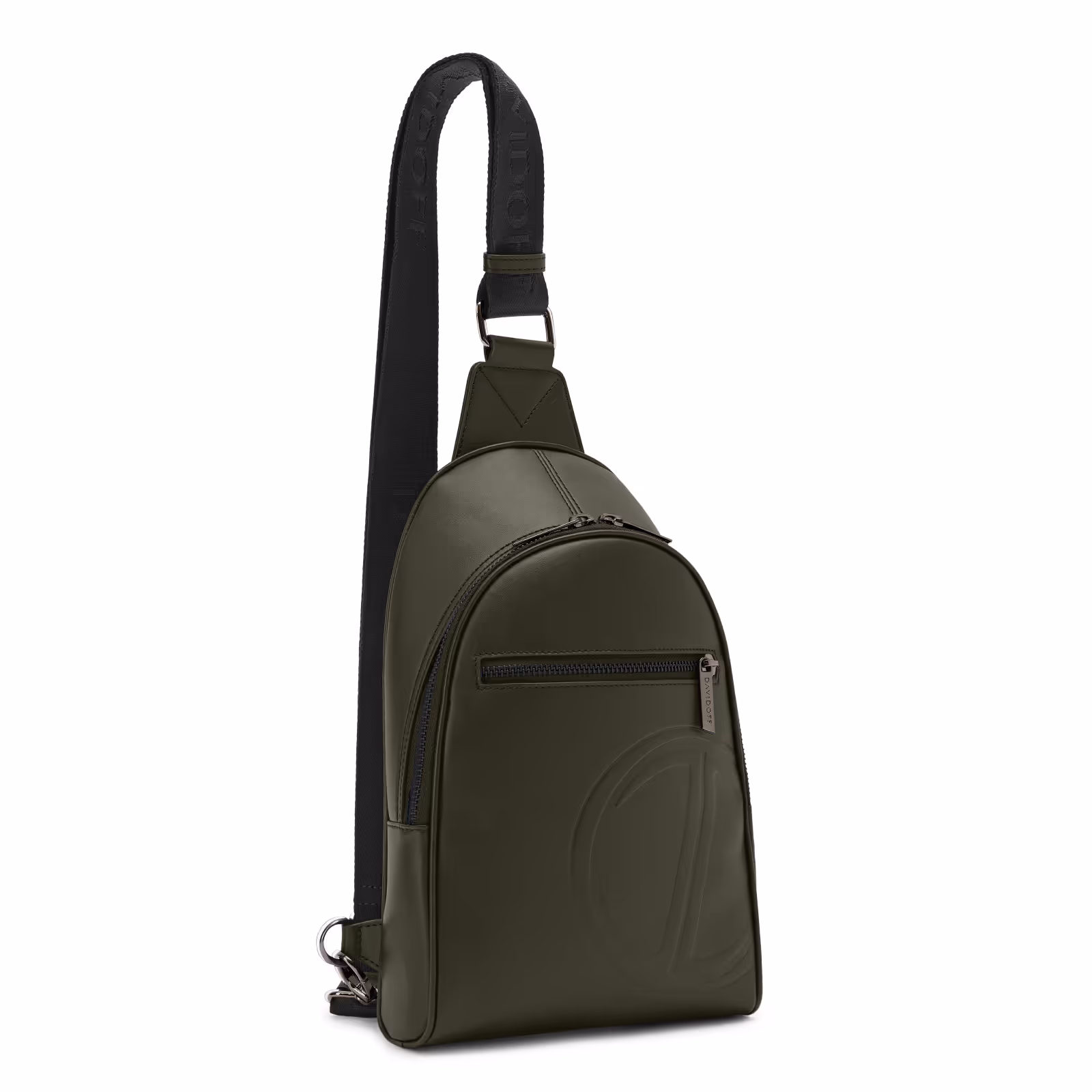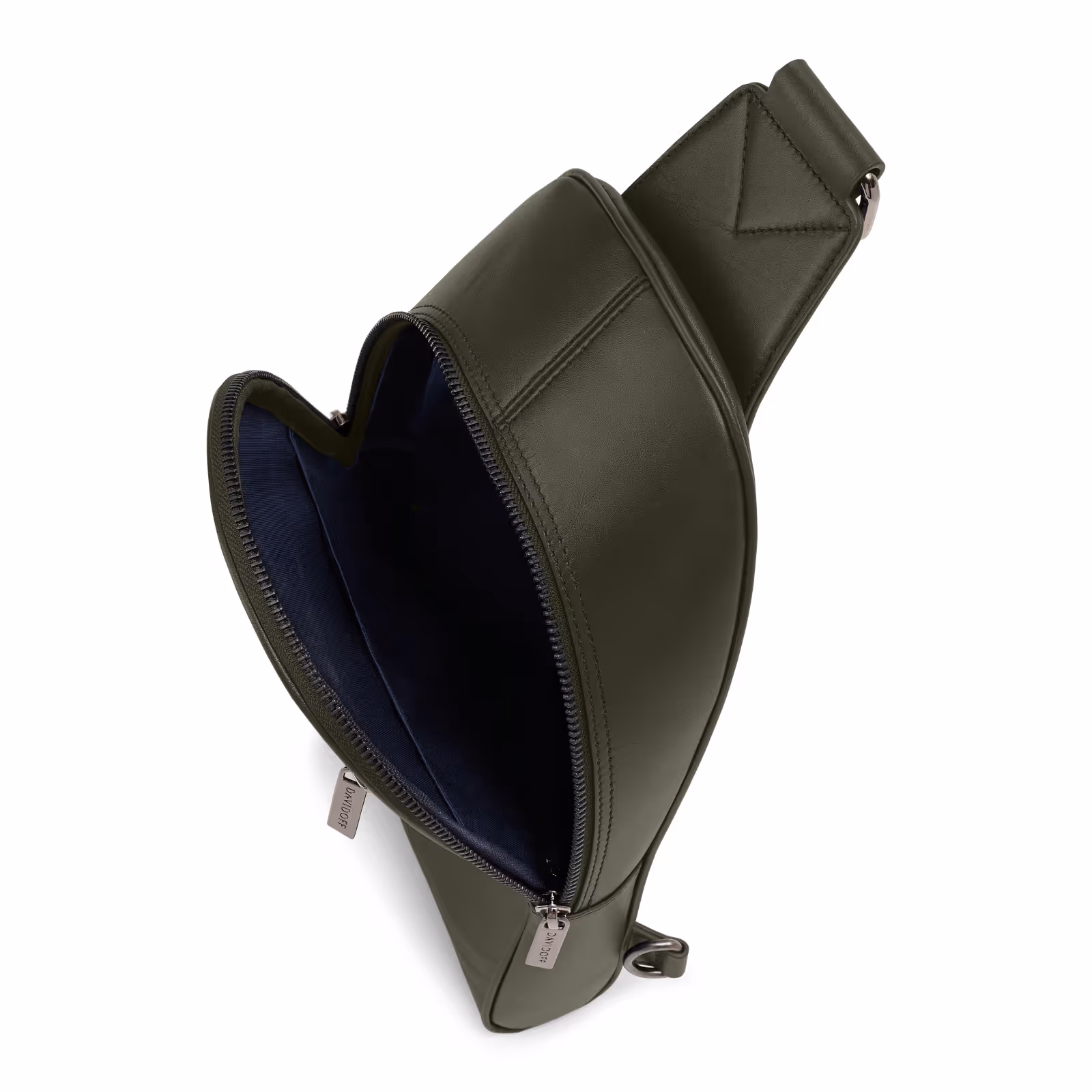 Crossbody Bag 1 zip with double zip pullers in soft calf leather with a constructed structure for a rigid touch. Front side with one zipped pocket. One zippped pocket at the back. All linings in polycotton blue color. DAVIDOFF logo, made in Italy and icon printed in silver on a leather tag centered inside the bag. Icon debossed on the front side at the bottom, right hand. All metal parts are in gun metal color. Zip pullers are gun metal plated with DAVIDOFF logo and hyphen shape. Bag comes with adjustable shoulder strap in textile with DAVIDOFF logo. Inside: one open pocket with leather piping same color as the bag at one side and one zipped pocket on the other side. Bag is entirely made in Italy.