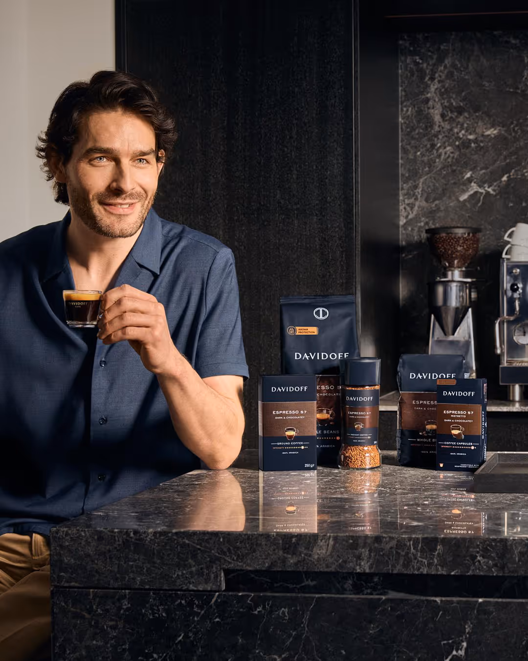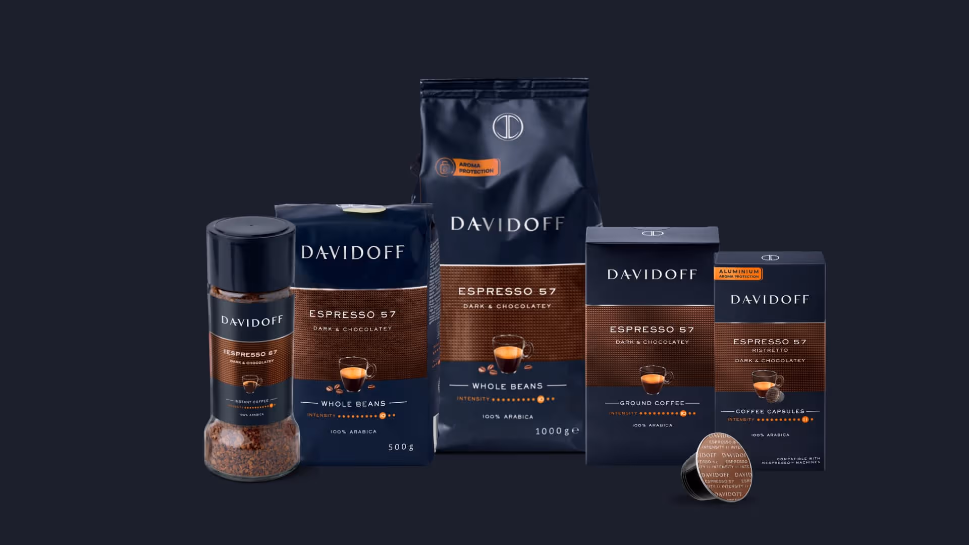 DAVIDOFF Espresso 57, a dark, intense roast, produces a true, distinctive espresso flavor with a smooth aroma and light chocolate notes. The finest Latin American Arabica beans are roasted individually with an ideal balance of roasting time and temperature, then perfectly blended.